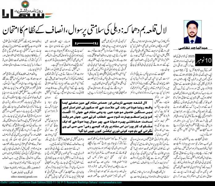یہ وقت صرف شکایت کا نہیں بلکہ اجتماعی شعور اور جدوجہد کا ہے۔ مسلمانوں کو اس چیلنج سے نکلنے کے لیے اپنے اندر بیداری اور تنظیم پیدا کرنی ہوگی۔ قانونی تعلیم اور حقوق کا شعور عام کیا جائے، قابلِ اعتبار وکیلوں سے مستقل تعلق رکھا جائے، اور میڈیا میں مثبت نمائندگی کے ذریعے اپنا مؤقف دلیل کے ساتھ پیش کیا جائے۔ تعلیم اور روزگار پر توجہ دی جائے تاکہ کمزوری کو طاقت میں بدلا جا سکے۔ سماجی یکجہتی کو فروغ دیا جائے، مساجد، تنظیموں، اور تعلیمی اداروں کو اجتماعی قوت میں تبدیل کیا جائے۔ لال قلعہ بم دھماکہ محض ایک دہشت گردانہ واقعہ نہیں بلکہ ہمارے انصاف کے نظام، سکیورٹی ڈھانچے اور اجتماعی ضمیر کے امتحان کا موقع ہے۔ اگر اس واقعے کی تفتیش غیر جانبدارانہ، شفاف اور سائنسی بنیادوں پر نہیں کی گئی، تو نہ صرف بے گناہوں کی زندگی تباہ ہوگی بلکہ پورے معاشرے کا اعتماد بھی متزلزل ہو جائے گا۔ حکومت، عدلیہ اور عوام — تینوں کو مل کر انصاف کی بنیاد پر ایک نئے اعتماد کی تعمیر کرنی ہوگی، کیونکہ قومیں صرف بموں سے نہیں، ناانصافی سے ٹوٹتی ہیں۔ جب انصاف کمزور پڑ جائے تو امن خود بم بن جاتا ہے۔